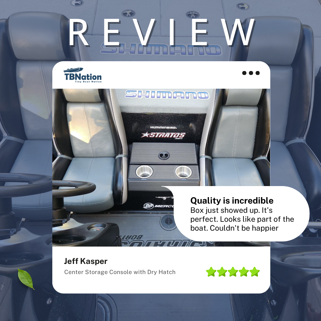 Our newest version of the center storage console box, now featuring a dry hatch lid and custom Charcoal Grey EVA foam turf. Beautiful black powder coat gives these boxes a long lasting durable finish, and 2 built in cup holders.