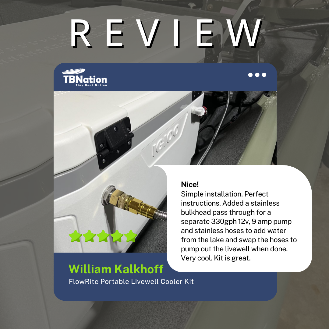 Turn any cooler into a professional grade recirculating livewell in just minutes. With the patented FlowRite QwikLok connectors make it easy to pump out, connect to previous plumbing in your boat, or dis-assemble. Great way to make your Yeti, Igloo, and other coolers into an easy-to-use livewell for your Jon Boat.