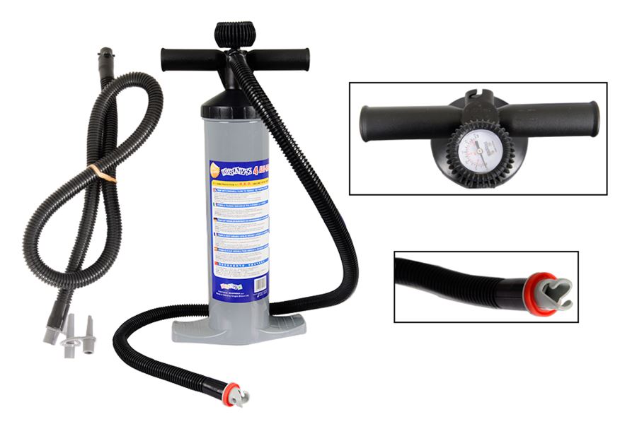 This pump’s special design allows for low effort and quick inflation. Made with a reliable and strong aluminum shaft. It comes equipped with 2 hoses - one with recessed one-way valve adapter, one with deluxe one way valve adapter - and an easy to read in-line pressure gauge. This pump capable of inflating to 11.6 PSI.